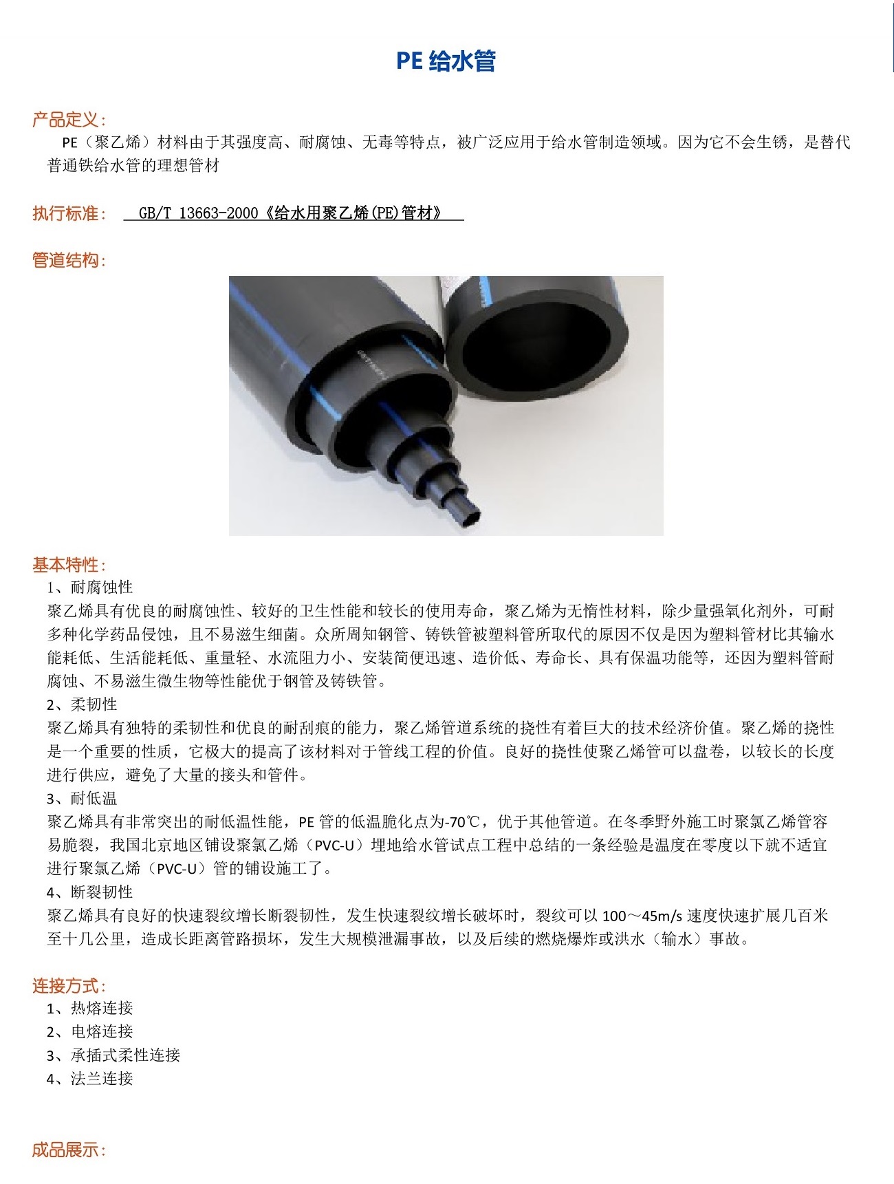 PE(聚乙烯)材料由于其強度高、耐腐蝕、無毒等特點,被廣泛應(yīng)用于給水管制造領(lǐng)域。因為它不會生銹,所以,是替代普通鐵給水管的理想管材。PE給水管執(zhí)行產(chǎn)品國家標準:GB/T 13663.1-2017、GB/T 13663.2-2018《給水用聚乙烯(PE)管道系統(tǒng)第2部分:管材》。